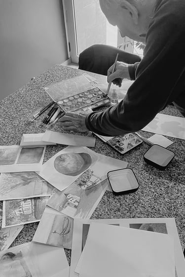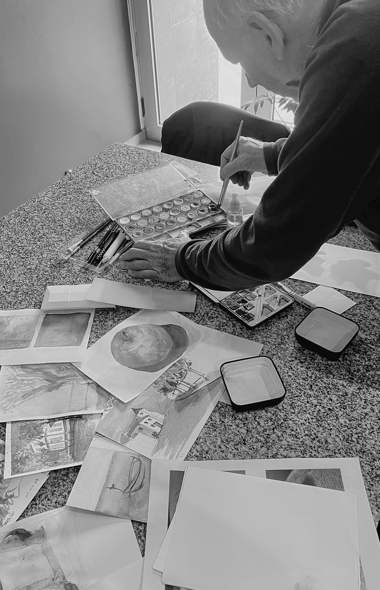 El dibujo a mano ha sido siempre una herramienta fundamental de expresión y comunicación, y una de sus grandes pasiones. Con lápices, tintas, fibras o acuarelas —en color o en blanco y negro— Daniel retrata paisajes naturales, fragmentos de ciudad y arquitectura, muchas veces surgidos de lugares que ha recorrido y observado en sus viajes. Ya jubilado, retomó con fuerza su vínculo con el arte y la pintura, explorando distintas técnicas en acuarela.